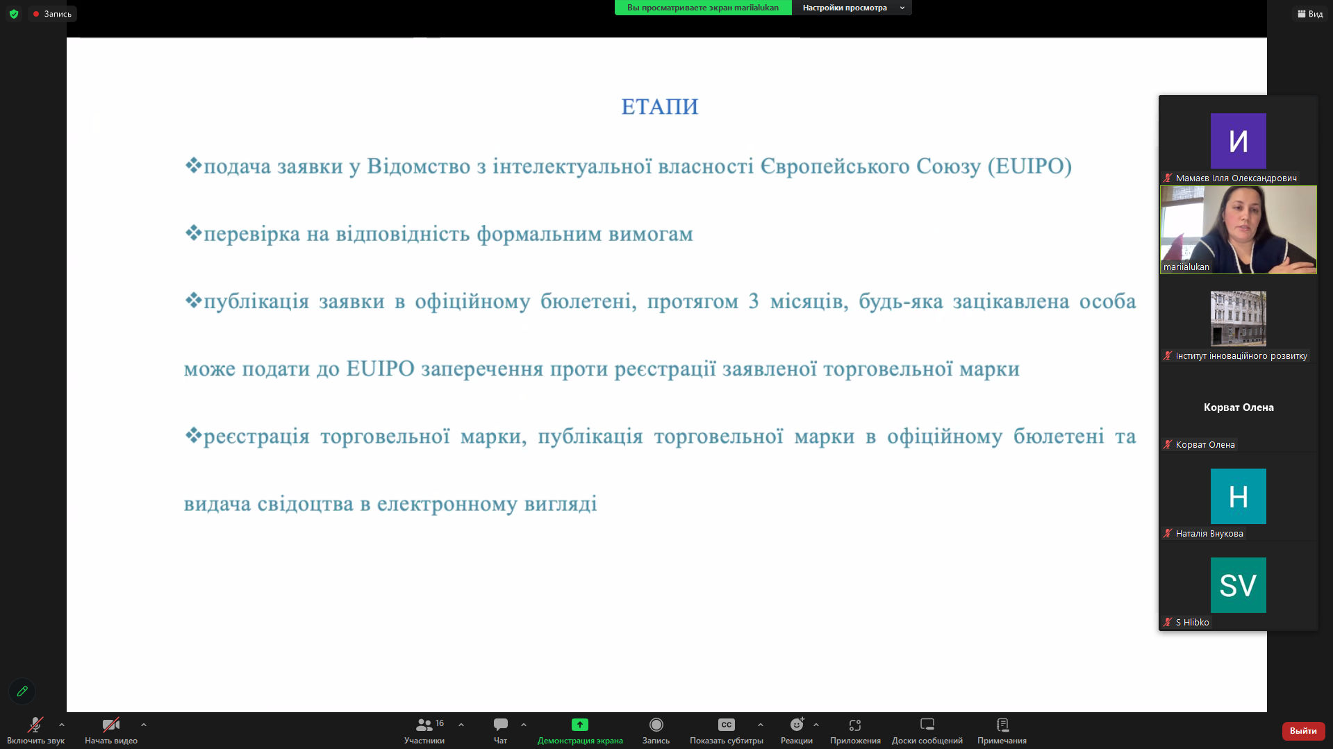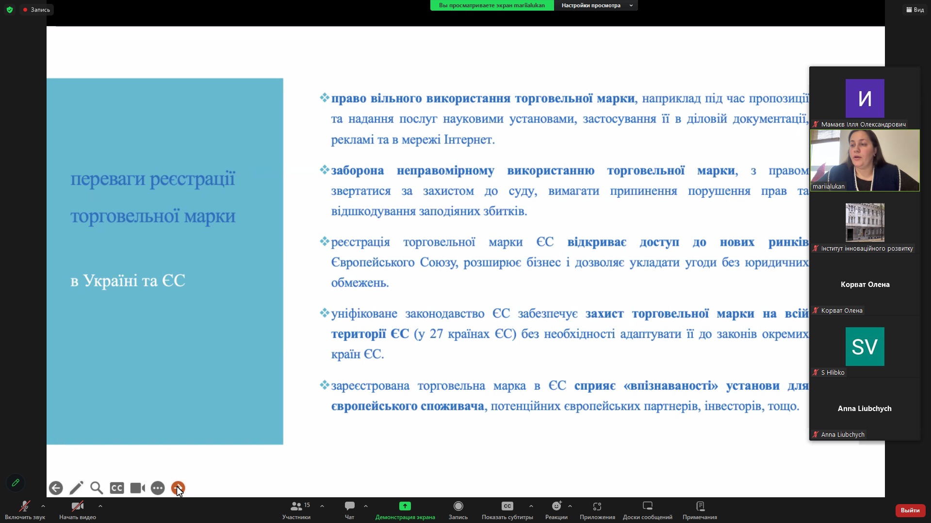 9 грудня 2025 року доктор філософії, молодший науковий співробітник НДІ ПЗІР НАПрН України Лукань Марія Олександрівна презентувала лекцію, присвячену реєстрації торговельної марки.