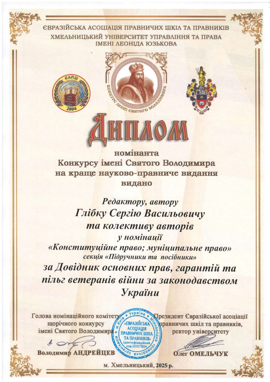 Диплом номінанта Конкурсу імені Святого Володимира на краще науково-правниче видання видано редактору та автору Глібку Сергію Васильовичу та колективу авторів у номінації «Конституційне право; муніципальне право» секція «Підручники та посібники» за Довідник основних прав, гарантій та пільг ветеранів війни за законодавством України.